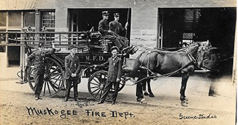 Muskogee has played an important part in Oklahoma history. By the end of the century the Muskogee business district, which surrounded Main Street, Okmulgee and Broadway, became a bustling area of shops, markets, saloons, hotels and theaters. In the late 1890’s the city had a volunteer fire department. Unfortunately, they were unable to cope with the great fire of 1904 that consumed a majority of the business district, including the city’s wooden firehouse.